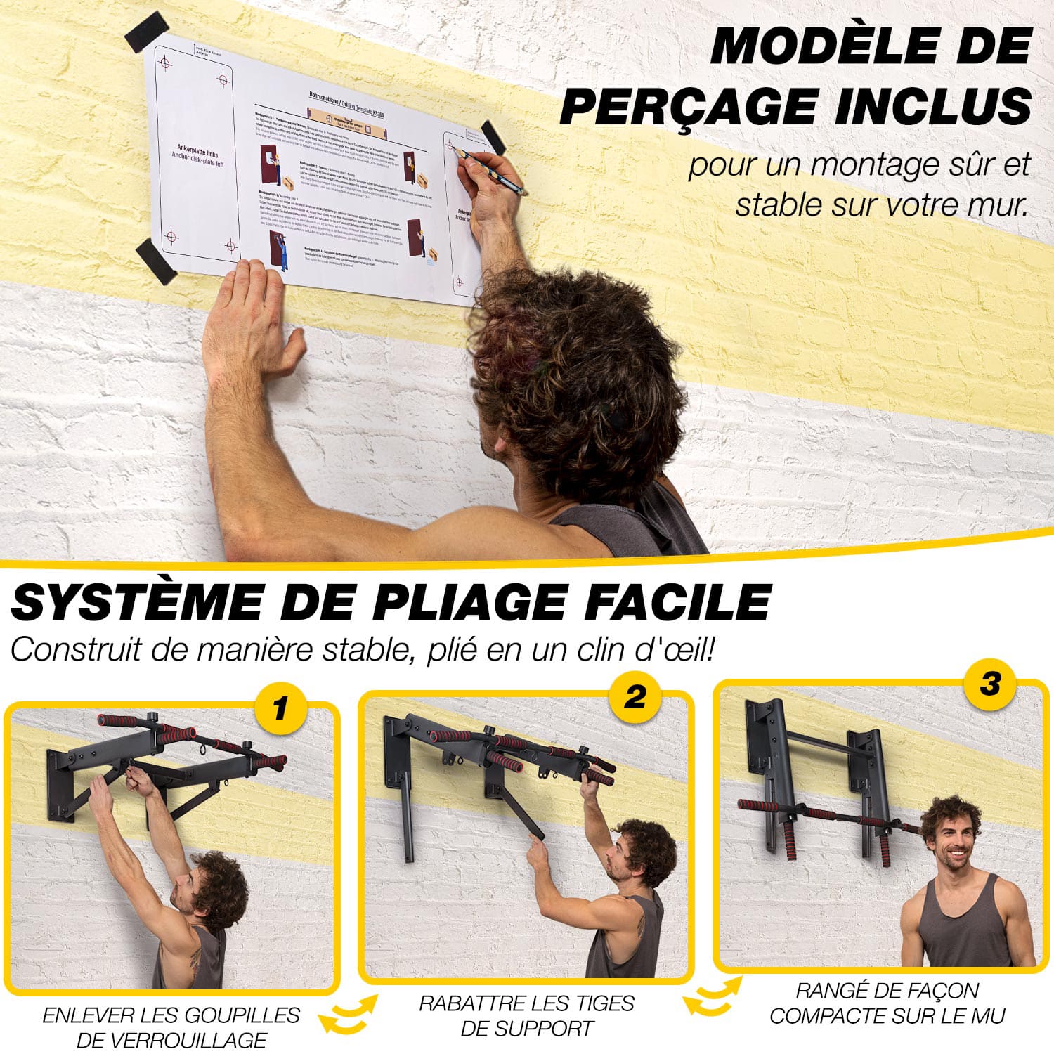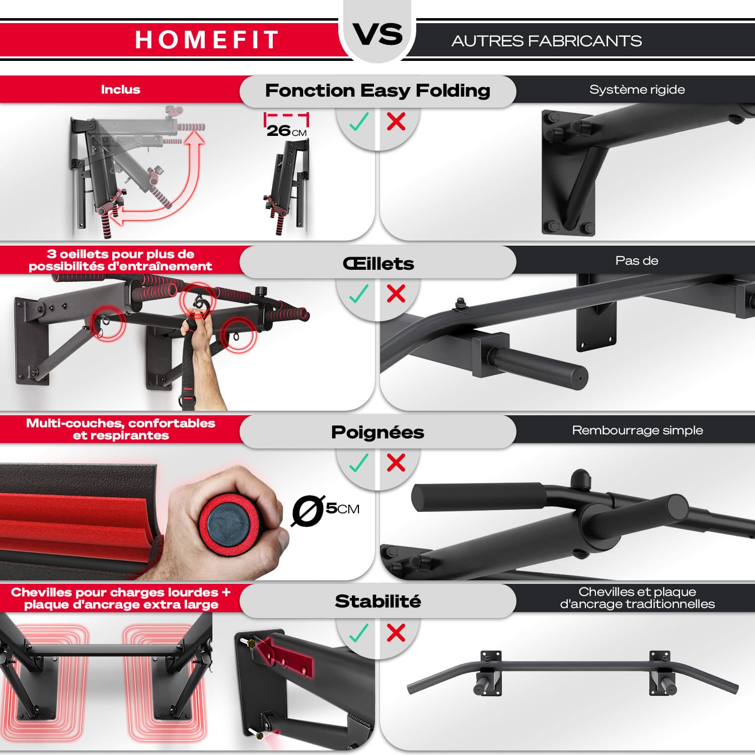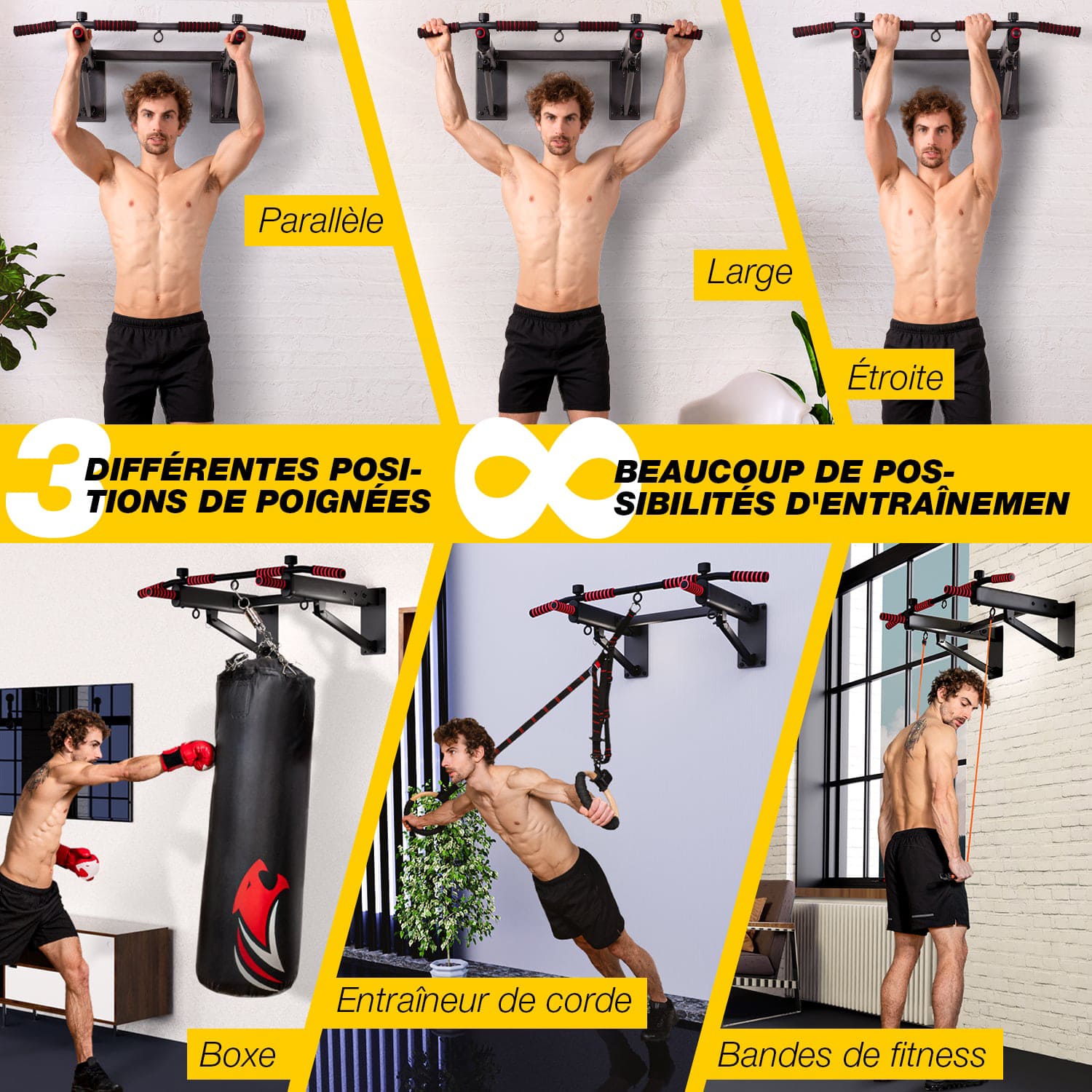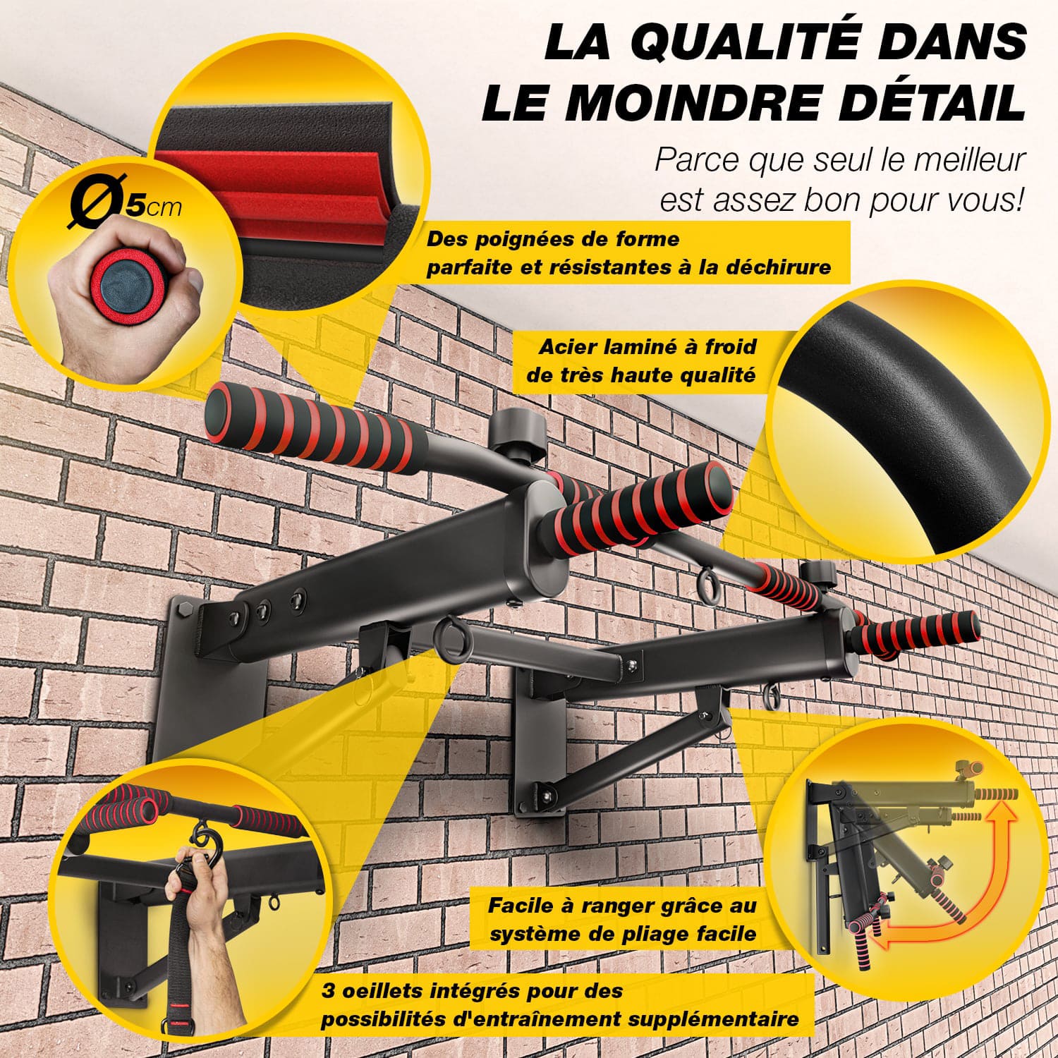 Grâce à son système de pliage intelligent, elle se replie facilement pour un gain de place maximal. Ses trois prises de préhension permettent de varier les exercices, et ses œillets intégrés offrent la possibilité d’ajouter un sac de frappe, des sangles de suspension ou des anneaux de gymnastique.