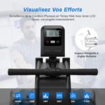 Doté d’un cadre en acier robuste, il assure une stabilité optimale et supporte jusqu’à 150 kg. Son écran LED connecté en Bluetooth permet un suivi précis des performances (temps, distance, calories, vitesse, nombre de coups). Avec son siège ergonomique, son support tablette intégré et sa fonction de rangement vertical, le RowMaster allie réalisme, confort et gain de place pour un entraînement immersif.