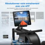 Le rameur à eau RowMaster est compatible avec l’application HomeSport (iOS & Android), offrant un suivi précis des performances avec affichage en temps réel de la durée, distance, calories brûlées et fréquence des mouvements.