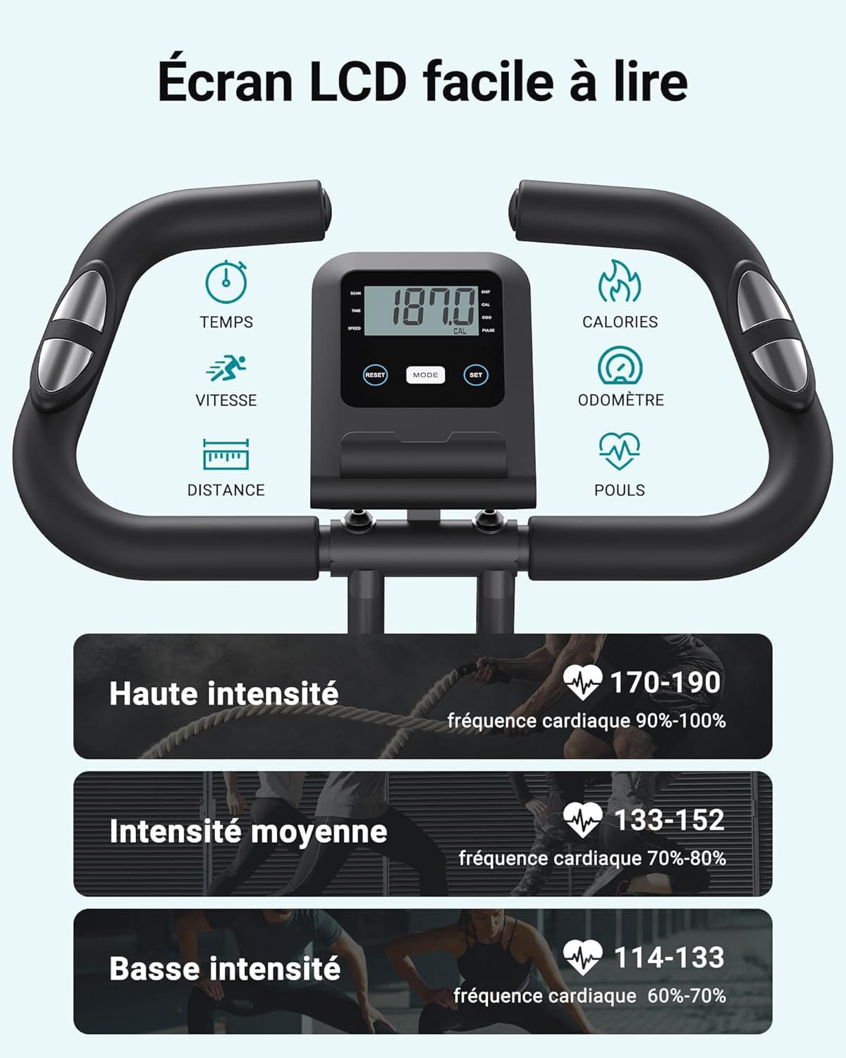 Écran LCD multifonction : Affiche la vitesse, le temps, la distance parcourue et les calories brûlées.